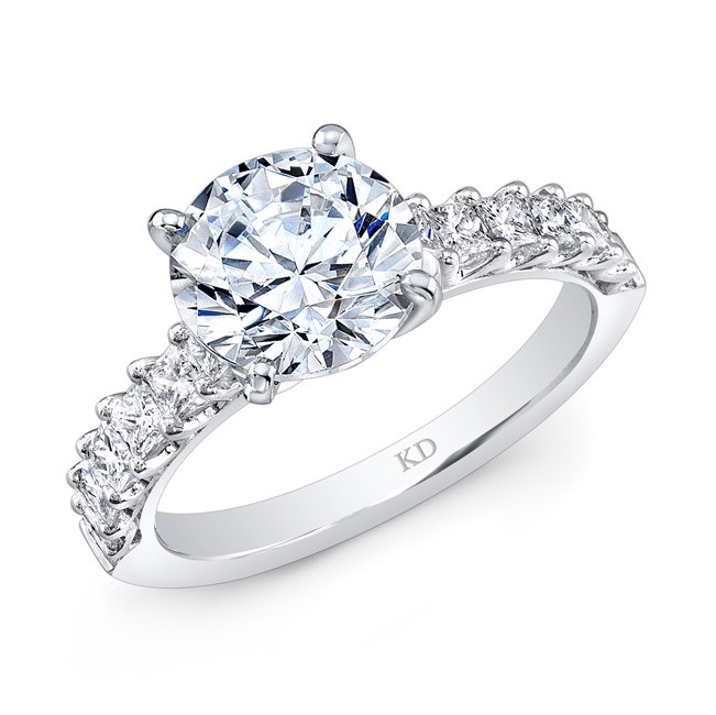 18K WHITE GOLD CLASSIC DIAMOND SEMI-MOUNT WITH FOUR PRONG CENTER, COMPLEMENTED WITH PRINCESS WHITE DIAMONDS, FEATURES 0.64 CARAT TOTAL WEIGHT