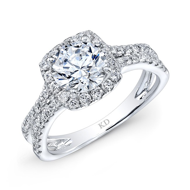 18K WHITE GOLD DIAMOND HALO SPLIT SHANK SEMI-MOUNT, DESIGNED WITH TWO ROWS OF ROUND WHITE DIAMONDS AND FEATURES 0.63 CARAT TOTAL WEIGHT
