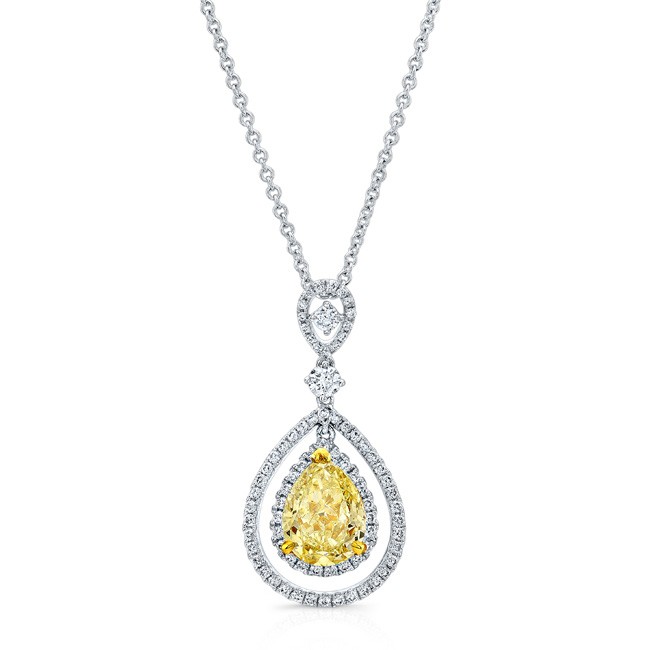 18K WHITE AND YELLOW GOLD TEAR DROP DESIGN PENDANT FEATURING NATURAL FANCY YELLOW PEAR TOTALING 1.52 CARAT AND SURROUNDED BY ROWS OF ROUND WHITE DIAMONDS
