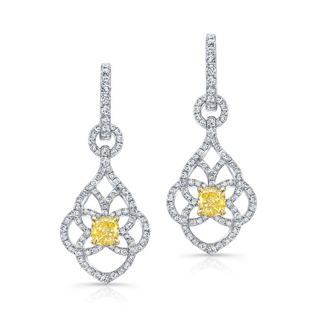 WHITE AND YELLOW GOLD FANCY YELLOW CUSHION DIAMOND DANGLE EARRINGS