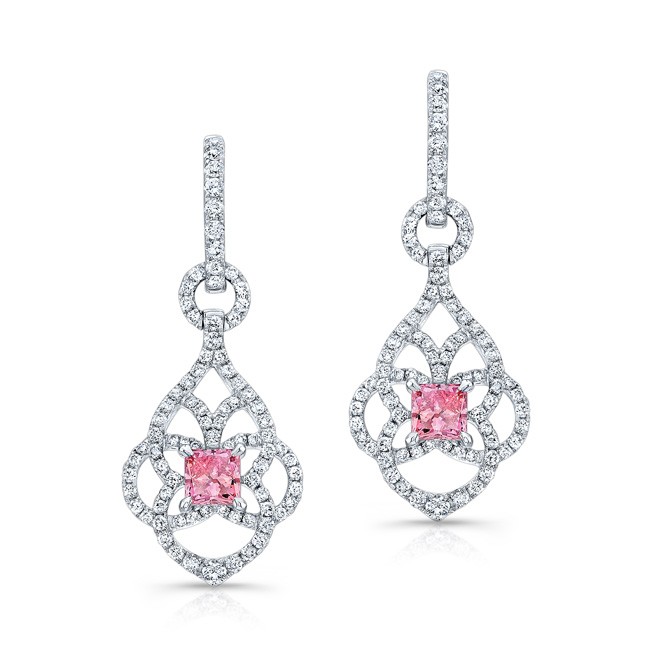 WHITE GOLD VINTAGE PINK ENHANCED PRINCESS DIAMOND DROPLET EARRINGS