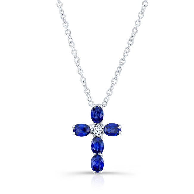 NATURAL COLOR WHITE GOLD ELEGANT SAPPHIRE CROSS DIAMOND PENDANT