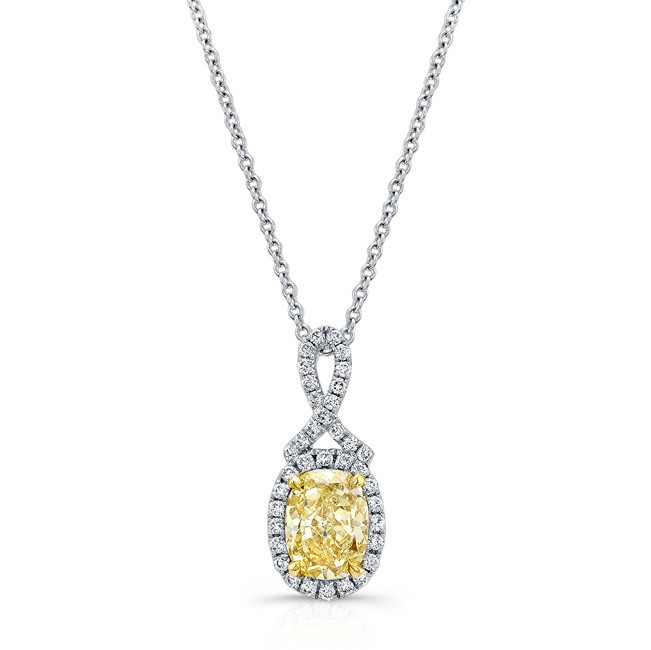 WHITE AND YELLOW GOLD TWISTED FANCY YELLOW CUSHION DIAMOND PENDANT