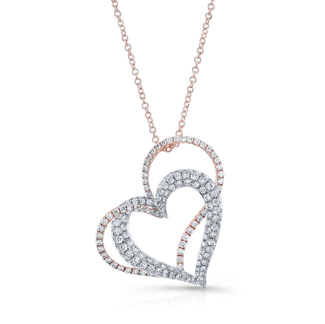 18K WHITE AND ROSE GOLD CONTEMPORARY HEART DIAMOND PENDANT, DESIGNED WITH ROUND WHITE DIAMONDS, FEATURES 1.15 CARAT TOTAL WEIGHT