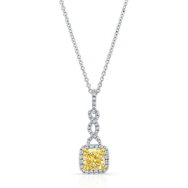 WHITE AND YELLOW GOLD CUSHION FANCY YELLOW DIAMOND TWISTED PENDANT