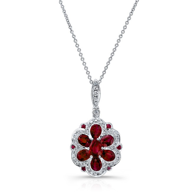 HIGH QUALITY NATURAL COLOR 18K WHITE GOLD VINTAGE PEAR & ROUND RUBY DIAMOND FLOWER PENDANT DESIGNED WITH ROUND WHITE DIAMONDS, FEATURES 2.65 CARAT TOTAL WEIGHT
