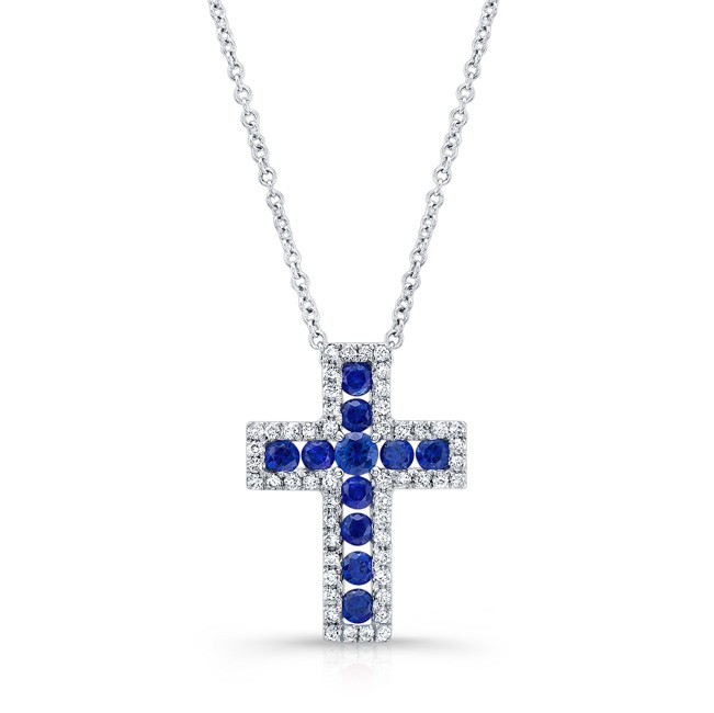 NATURAL COLOR WHITE GOLD ELEGANT SAPPHIRE CROSS DIAMOND PENDANT